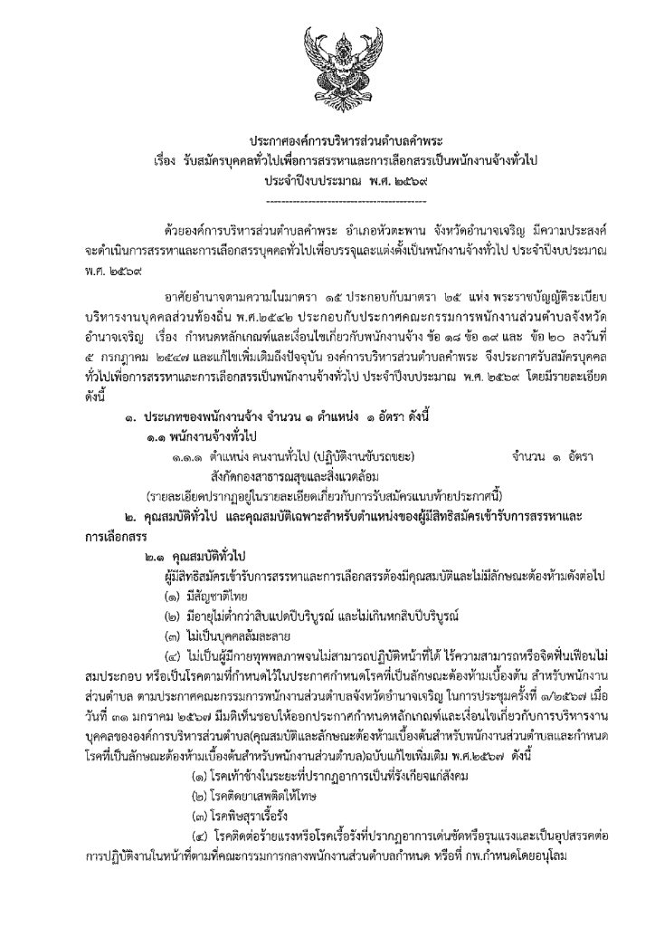 ประกาศองค์การบริหารส่วนตำบลคำพระ เรื่อง ประกาศรับสมัครบุคคลทั่วไป เพื่อการสรรหาและการเลือกสรรเป็นพนักงานจ้างทั่วไปประจำปีงบประมาณ พ.ศ.2569