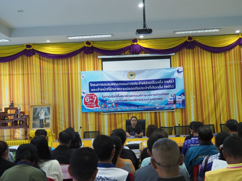 โครงการอบรมคณะกรรมการประจำหน่วยเลือกตั้งและเจ้าหน้าที่รักษาความปลอดภัยประจำที่เลือกตั้งวันที่ 6-7 มกราคม 2569 เวลา 08.30 น. นางชบาไพ ไชยเอก ประธานกรรมการการเลือกตั้งประจำองค์การบริหาร่วส่วนตำบลคำพระ เป็นประธานในพิธีเปิด โครงการอบรมคณะกรรมการประจำหน่วยเลือกตั้ง (กปน.) และเจ้าหน้าที่รักษาความปลอดภัยประจำที่เลือกตั้ง(รปภ.) โดยมี พ.จ.ต.วิเชียร มาหา ผู้อำนวยการการเลือกตั้งประจำองค์การบริหารส่วนตำบลคำพระ กล่าวรายงานฯ พร้อมด้วย คณะกรรมกรรมการการเลือกตั้งประจำองค์การบริหารส่วนตำบลคำพระ เข้าร่วมประชุม อบรมและซักซ้อมทำความเข้าใจในการปฏิบัติหน้าที่ของ “คณะกรรมการประจำหน่วยเลือกตั้งและเจ้าหน้าที่รักษาความปลอดภัยประจำที่เลือกตั้ง ของหน่วยเลือกตั้งในเขตองค์การบริหารส่วนตำบลคำพระ 12 หน่วยโดยได้รับความอนุเคราะห์ท่านวิทยากร โดย มี นายศราวุฒิ บุญเกษม นักพัฒนาชุมชนชำนาญการ และ นายศิโรจน์ ดาทอง ผู้อำนวยการกองสาธารณสุขและสิ่งแวดล้อม จาก คณะกรรมการการเลือกตั้งประจำองค์การบริหารส่วนตำบลคำพระ (ครู ข) การบรรยายและสาธิตการปฏิบัติหน้าที่ให้กับคณะกรรมการ (กปน.) ในการอบรมดังกล่าว