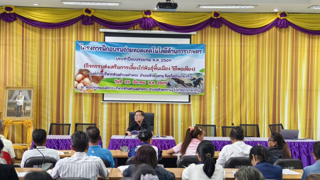 วันพฤหัสบดีที่ 26 มีนาคม 2569 เวลา 09.00 น. นายอุดร จันทป นายกองค์การบริหารส่วนตำบลคำพระ ประธานในพิธีเปิดโครงการฝึกอบรมถ่ายทอดเทคโนโลยีด้านการเกษตรประจำปีงบประมาณพ.ศ.2569 วัตถุประสงค์เพื่อเป็นการส่งเสริมให้เกษตรกรมีความเข้าใจในการเลี้ยงสัตว์ปีกพัฒนากลุ่มเกษตรกรในอนาคต และเพื่อส่งเสริมการประกอบอาชีพ โดยได้รับความอนุเคราะห์วิทยากร นายธนุส ธนะวิโรจน์ ปศุสัตว์อำเภอหัวตะพาน มาให้ความรู้ผู้เข้าร่วมอบรม ขอขอบผู้เข้าร่วมอบรมทุกท่านให้ความร่วมมือเป็นอย่างดี อบต.คำพระ หวังเป็นอย่างยิ่งว่า จะได้รับความร่วมมือเป็นอย่างดีเช่นเคย
