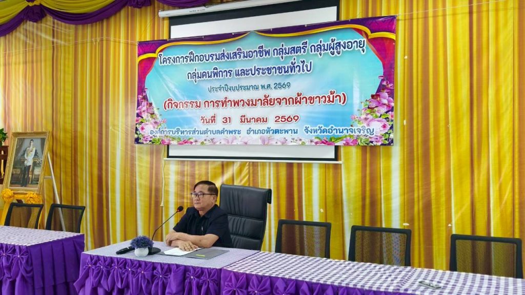 วันอังคารที่ 31 มีนาคม 2569 เวลา 09.00 น.นายอุดร จันทป นายองค์การบริหารส่วนตำบลคำพระ ประธานกล่าวเปิดโครงการฝึกอบรมส่งเสริมอาชีพ กลุ่มสตรี กลุ่มผู้สูงอายุ กลุ่มคนพิการ และประชาชนทั่วไป ประจำปีงบประมาณ พ.ศ. 2569 (#กิจกรรมการทำพวงมาลัยจากผ้าขาวม้า) โดยมีกลุ่มเป้าหมาย เข้าร่วมโครงการ กลุ่มสตรี กลุ่มผู้สูงอายุ กลุ่มคนพิการ และประชาชนทั่วไปตำบลคำพระ เพื่อมารับการฝึกอบรมโครงการดังกล่าวฯ เปลี่ยนผ้าทอพื้นเมืองให้กลายเป็นของระลึกทางคุณค่า เพิ่มพูนมูลค่าสินค้าชุมชนและสร้างรายได้เสริมให้กับครอบครัว ได้รับความอนุเคราะห์วิทยากรจาก นางสาวดวงจันทร์ โสภิพันธ์ และนางทองพูล ยศรุ่งเรือง มาให้ความรู้ผู้เข้าร่วมอบรม